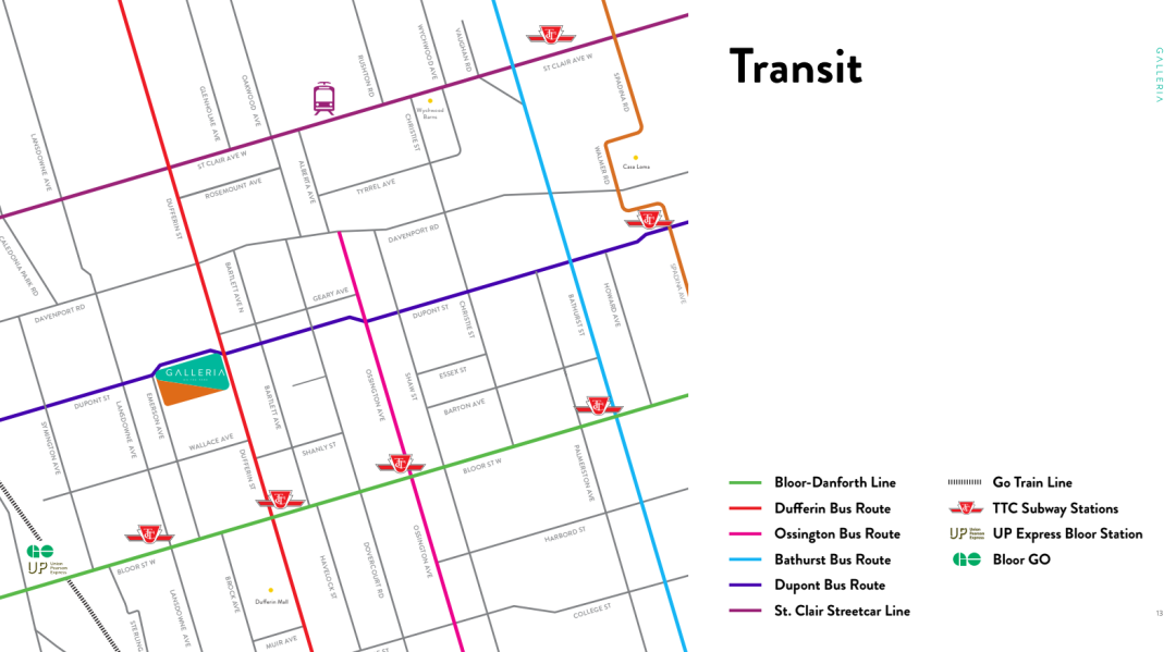 -TTC Bloor Danforth地铁线(Lansdowne和Dufferin站)距离Galleria On The Park公寓楼花仅10分钟步行路程,乘坐地铁不到30分钟即可抵达市中心Union Station。